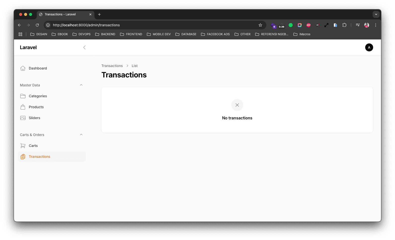 Jadi di atas kita sisakan hanya untuk index page saja. Sekarang jika teman-teman reload project-nya dan klik pada menu Transactions, maka hasilnya kurang lebih seperti berikut ini.